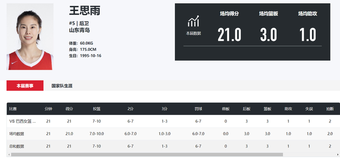 此役王思雨全场比赛替补20分钟,10中7,三分3中1,罚球7中6,拿到21分3篮板1助攻2抢断仅1失误,命中率70%,她的个人表现比多位年轻核心更出色。